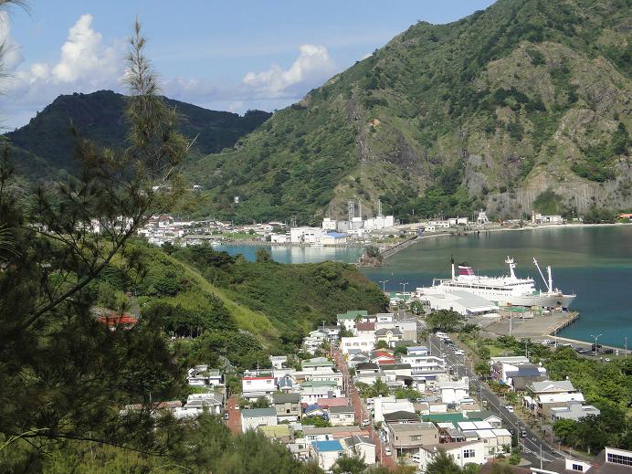 次は島内一周ツアー 「ここが町を一望できる場所です」 おがさわら丸も見えます。